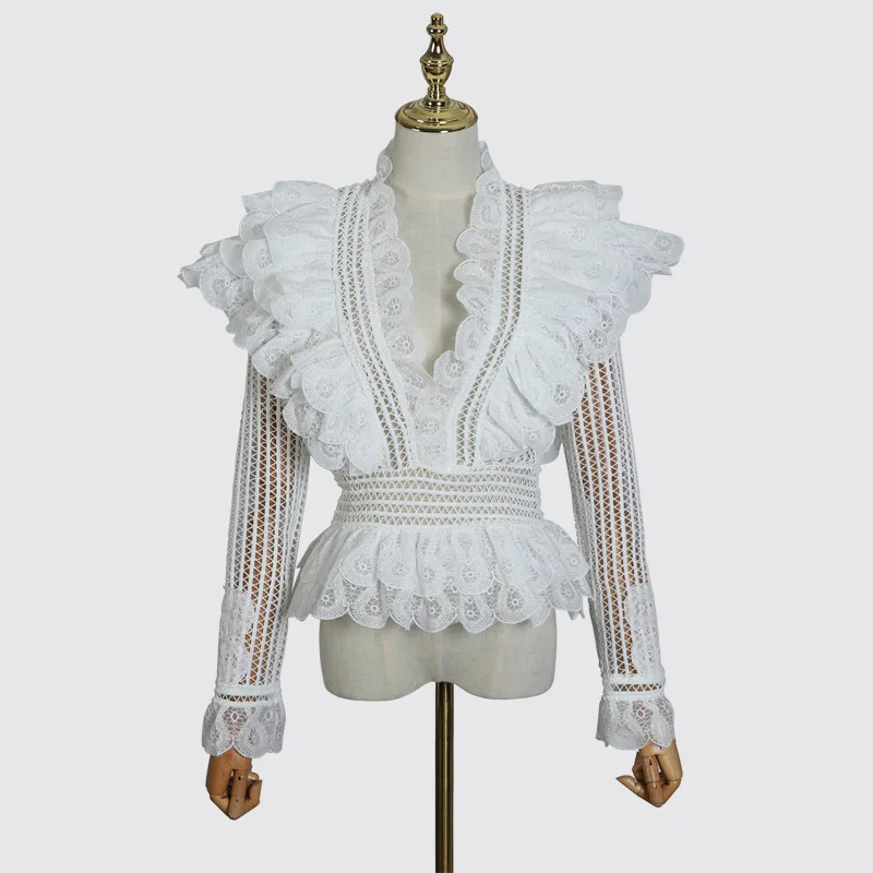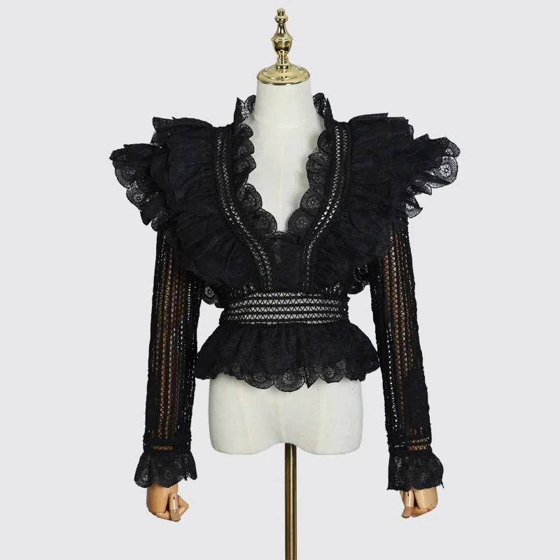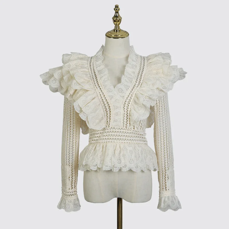 Vente Meilleur [MENKAY] 2018 Automne ZIM Évider V Cou Ruches Spliced Tops Femmes Chemise Nouveau Pas Cher En Ligne.